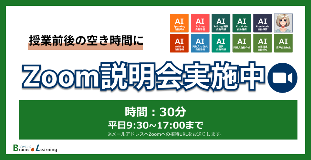 忙しい先生にも、授業の前後等の短い時間で当社の教材(AI英会話 Pro、AI Speaking、AI Writing、AI ICT Test Pro English、AI ICT テスト Pro)についてご説明いたします。